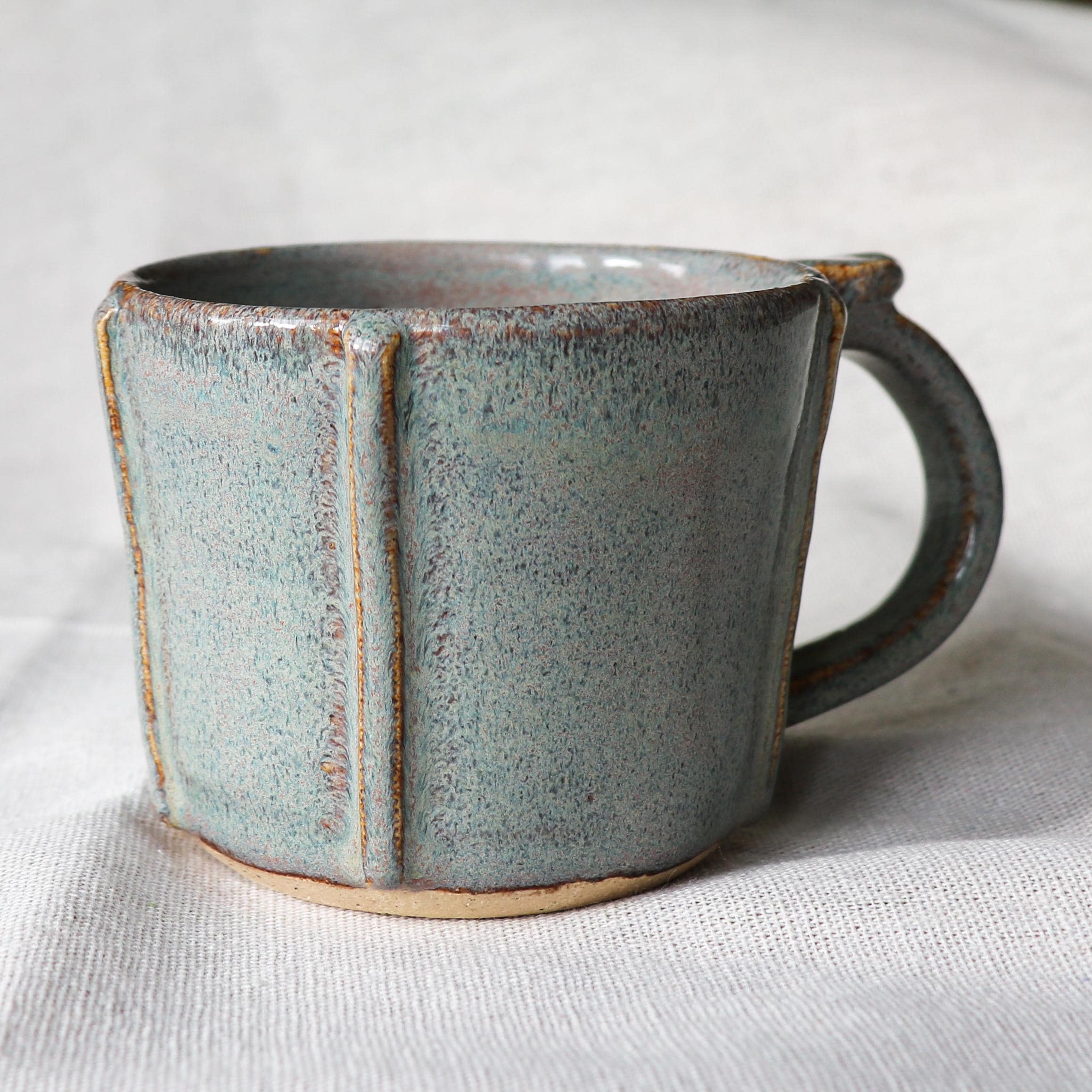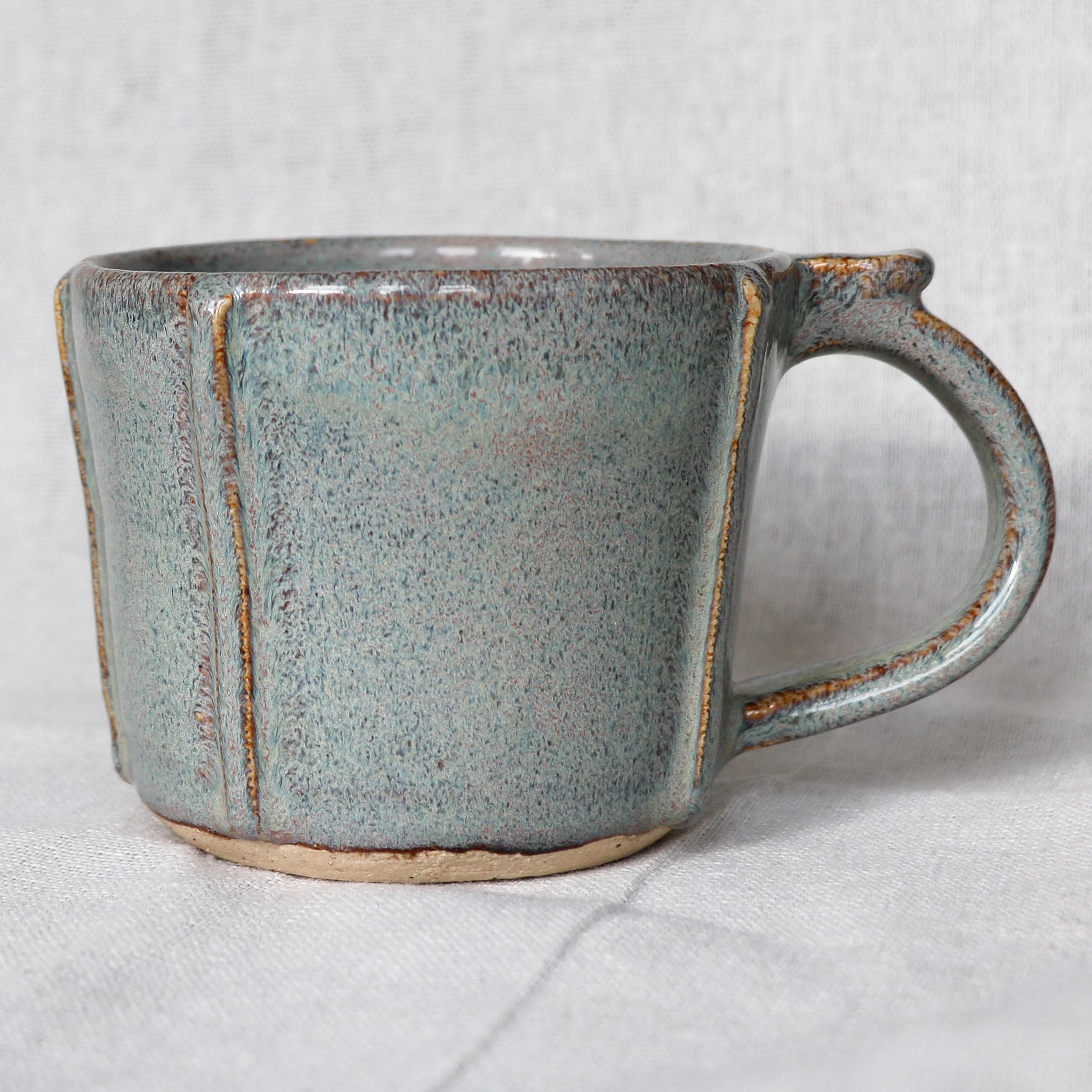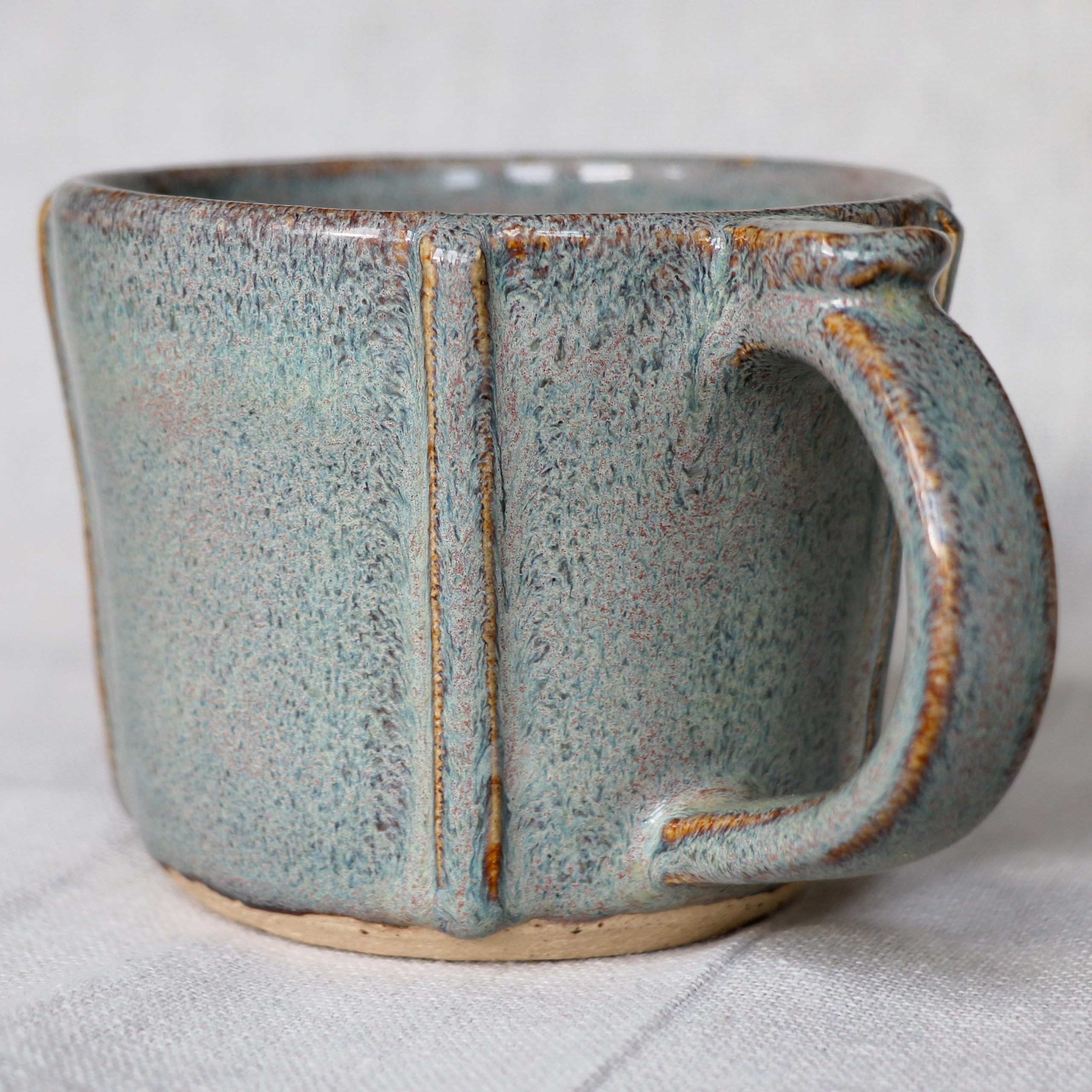 Hand thrown ceramic stoneware mug, hand textured after throwing and glazed with a Sage/Iron lustre glaze that gives a delicious grey green with slight hints of pink colour that melts and runs over the texture.