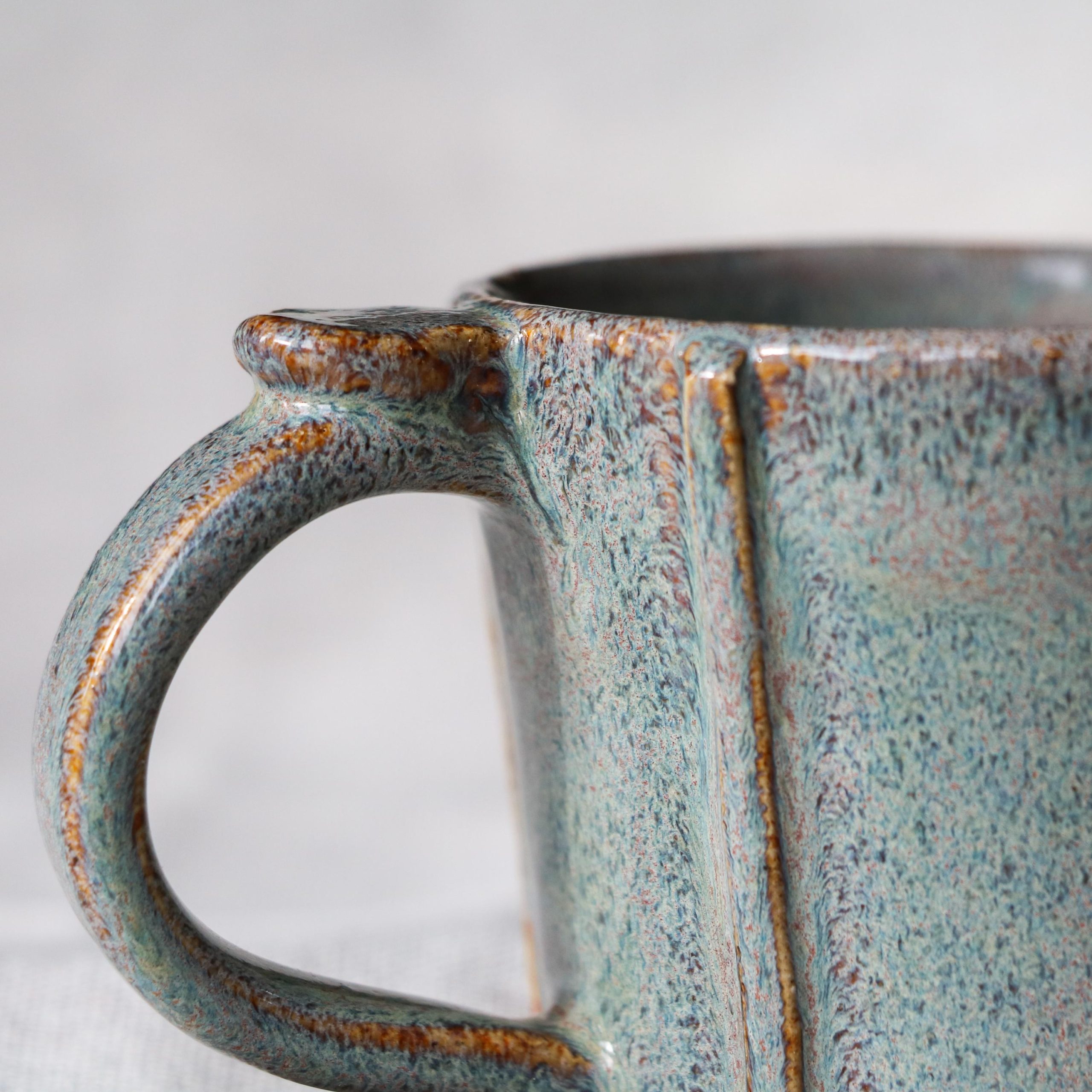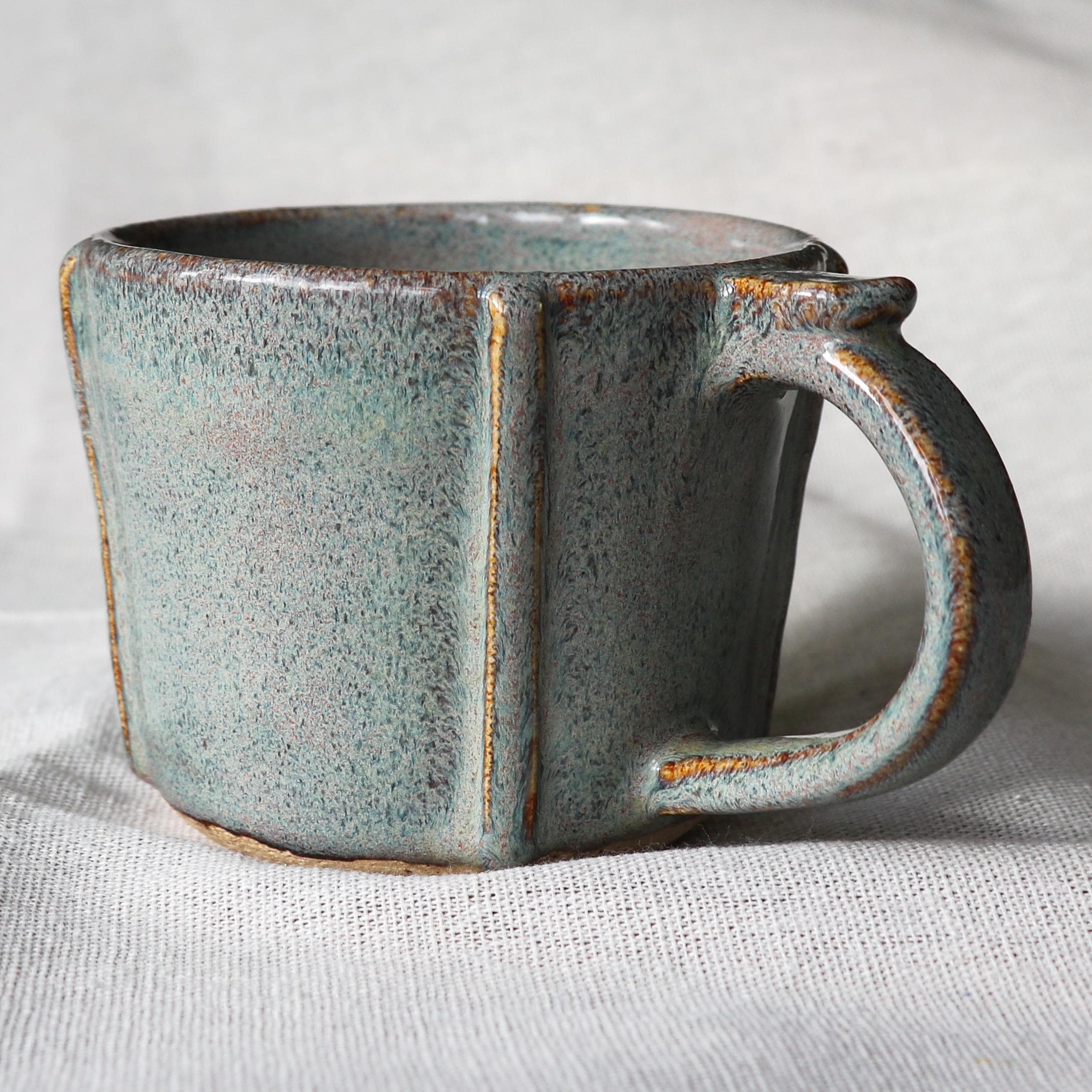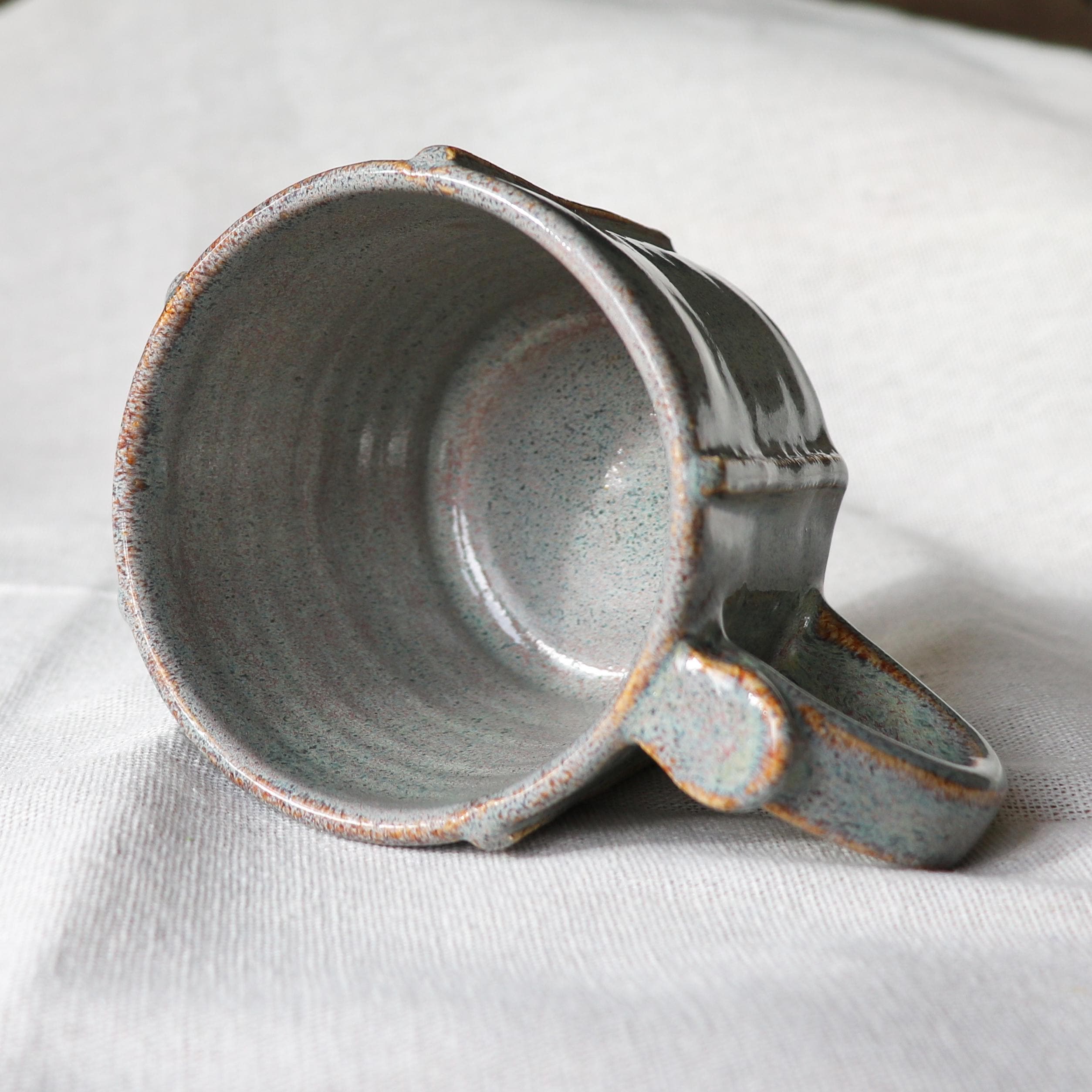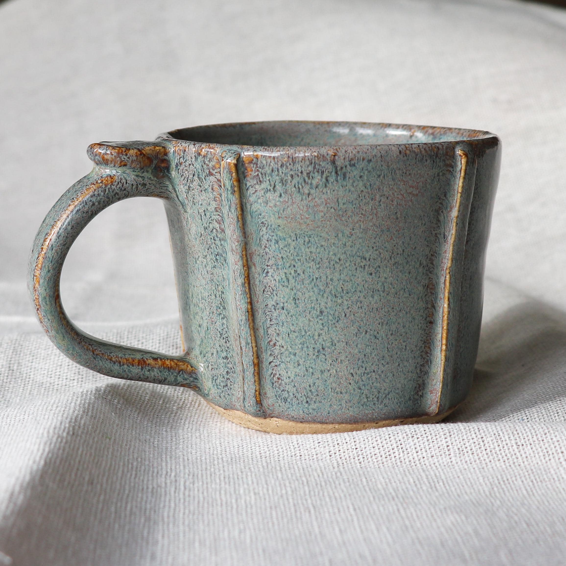 Hand thrown ceramic stoneware mug, hand textured after throwing and glazed with a Sage/Iron lustre glaze that gives a delicious grey green with slight hints of pink colour that melts and runs over the texture.