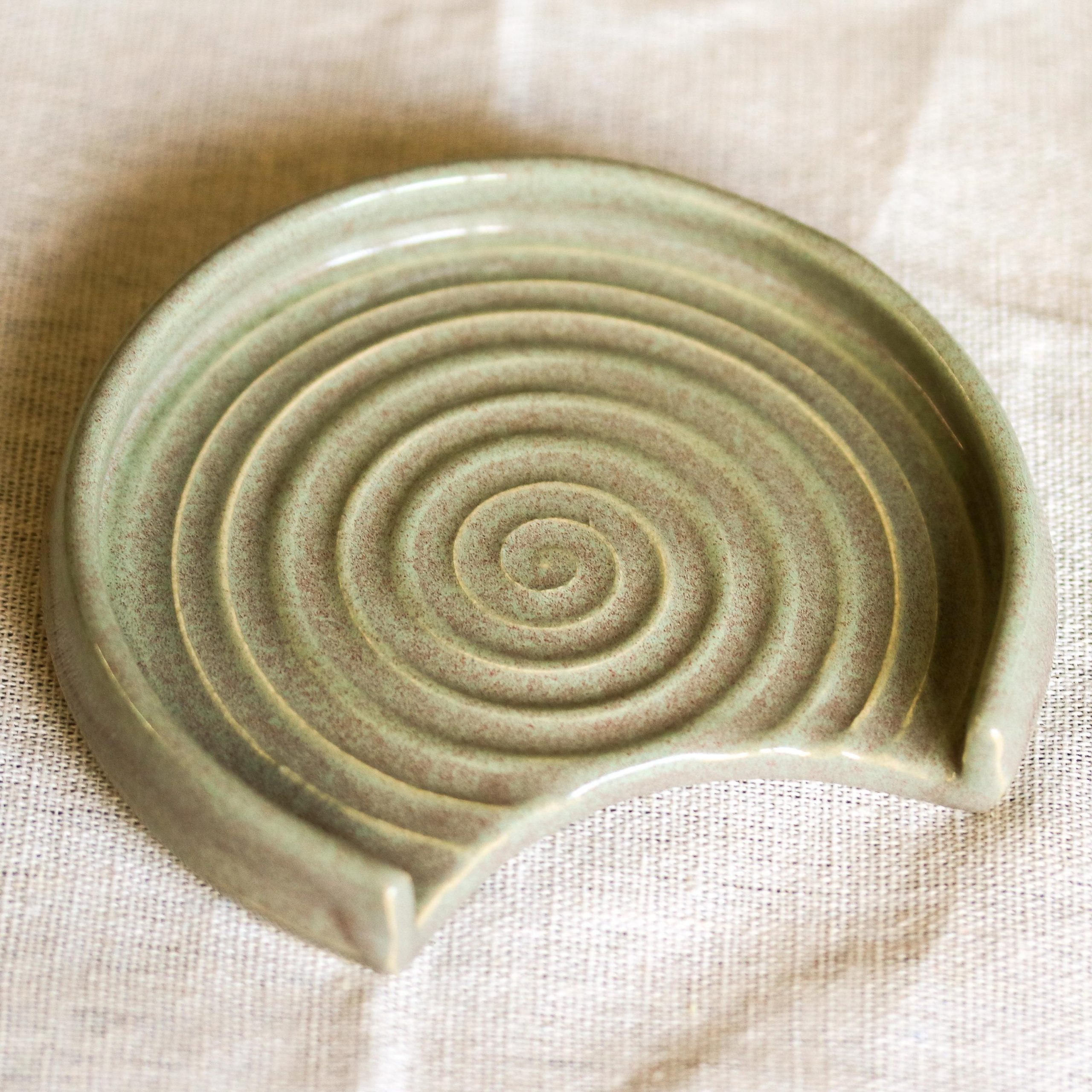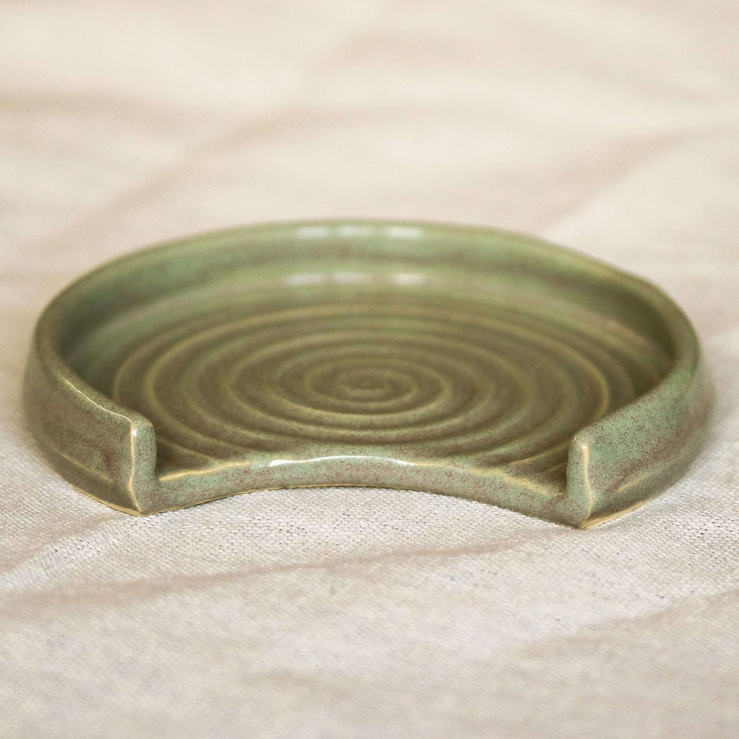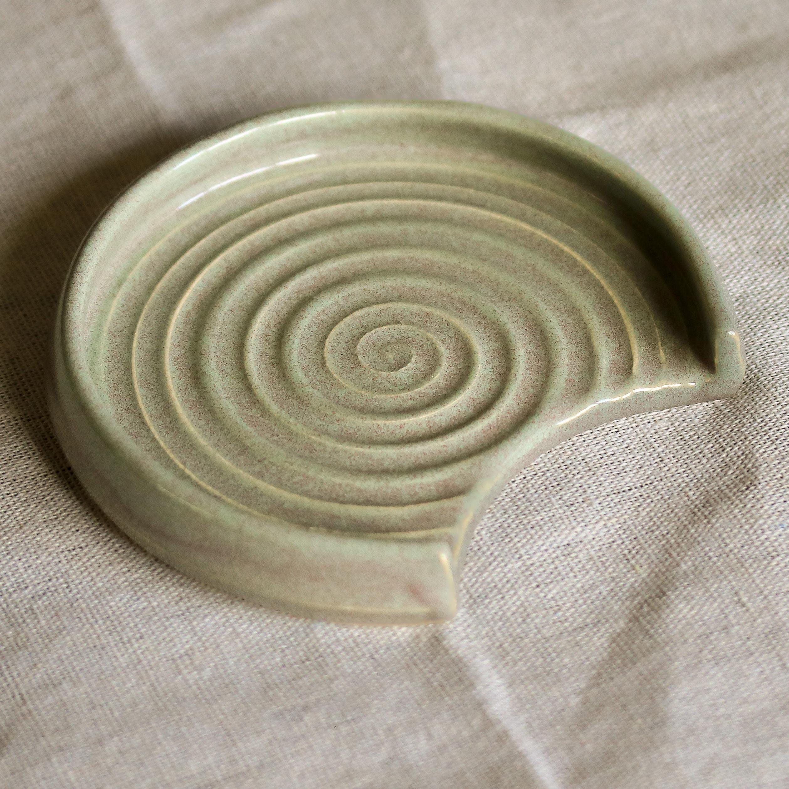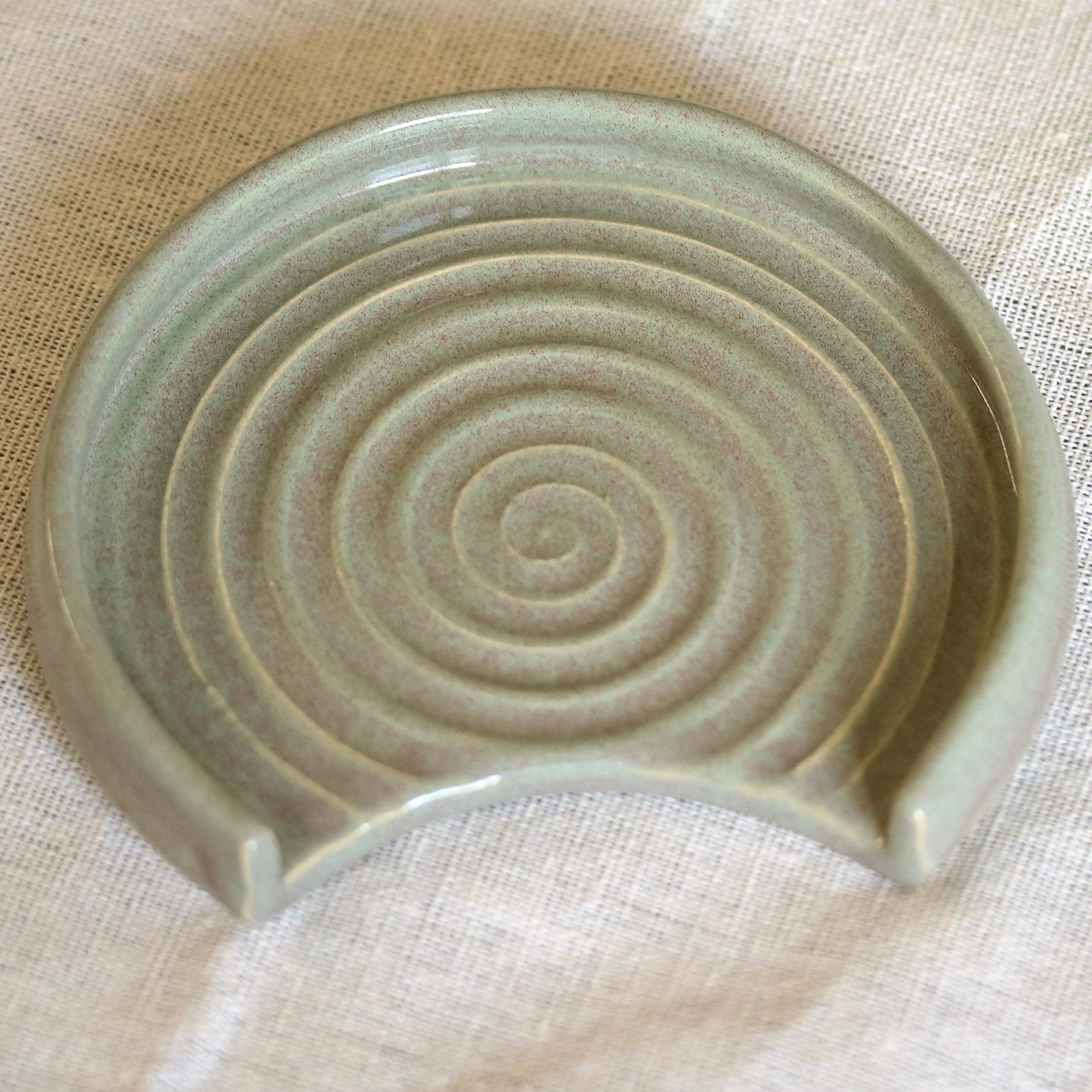 We hand throw on a wheel, then usually the next day the spoon rests are trimmed and left to dry thoroughly, after which they go through the first bisque firing. After this they are glazed by hand with a lovely Sage Green glaze and then fired again.