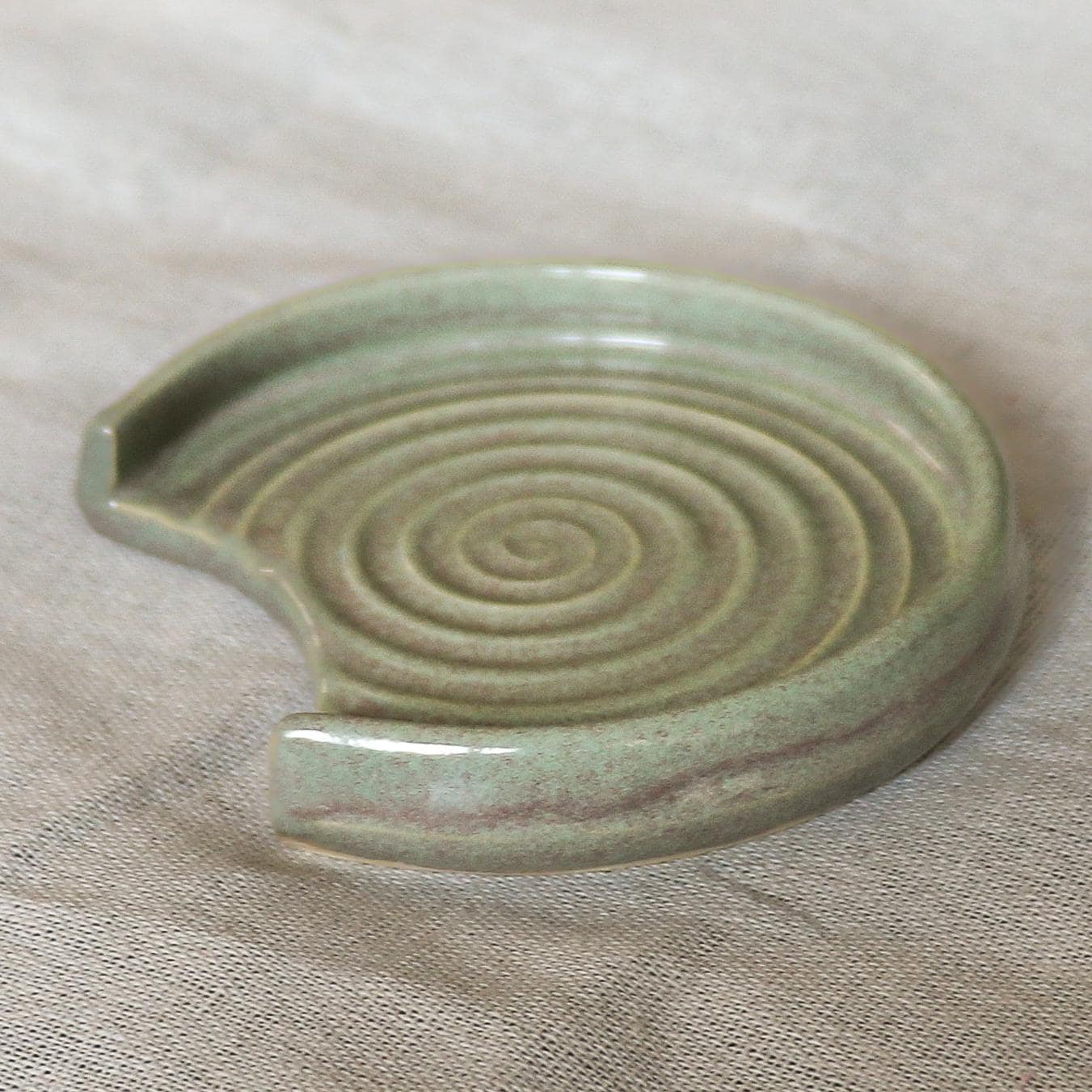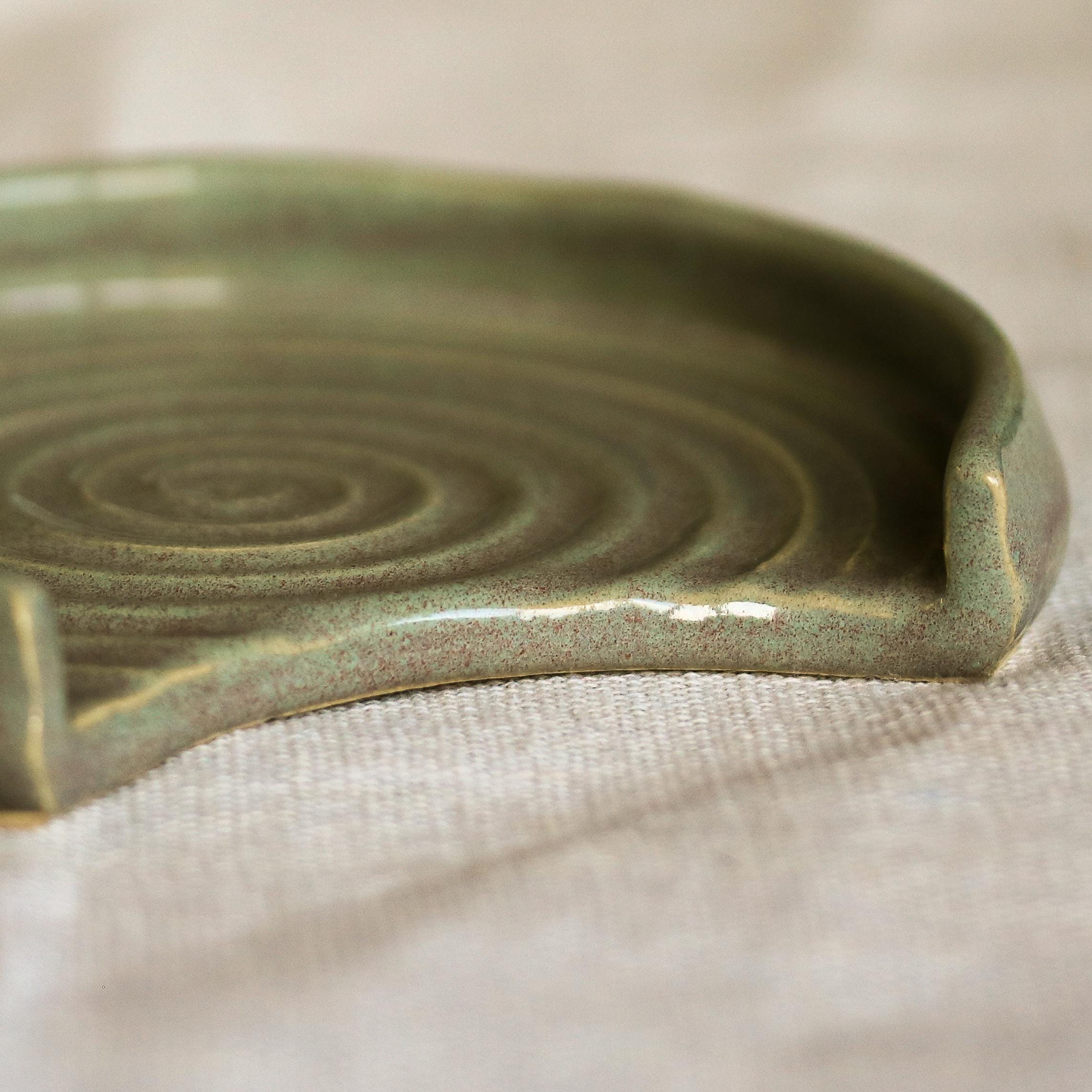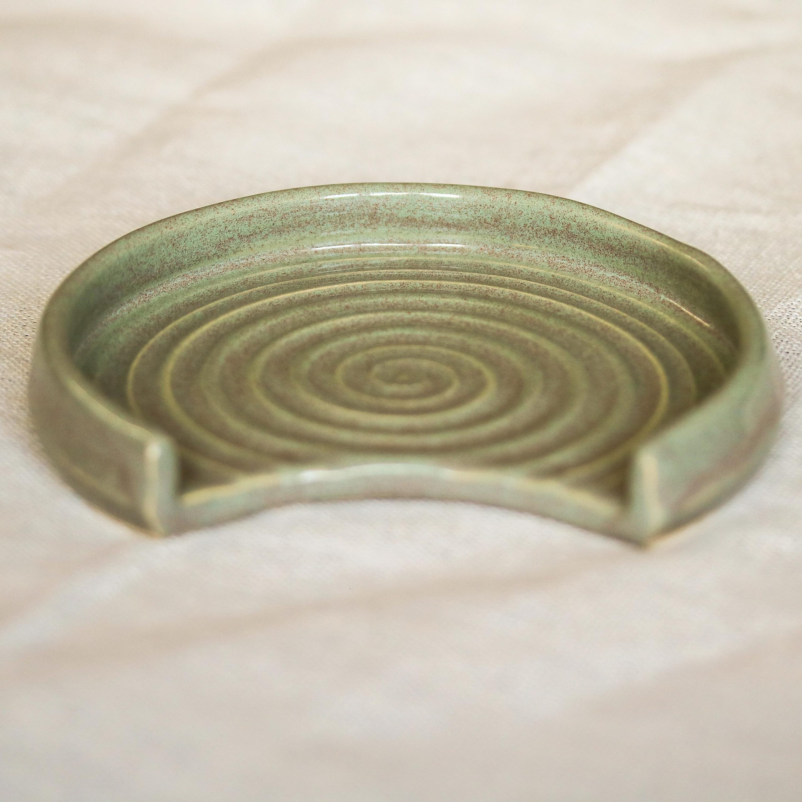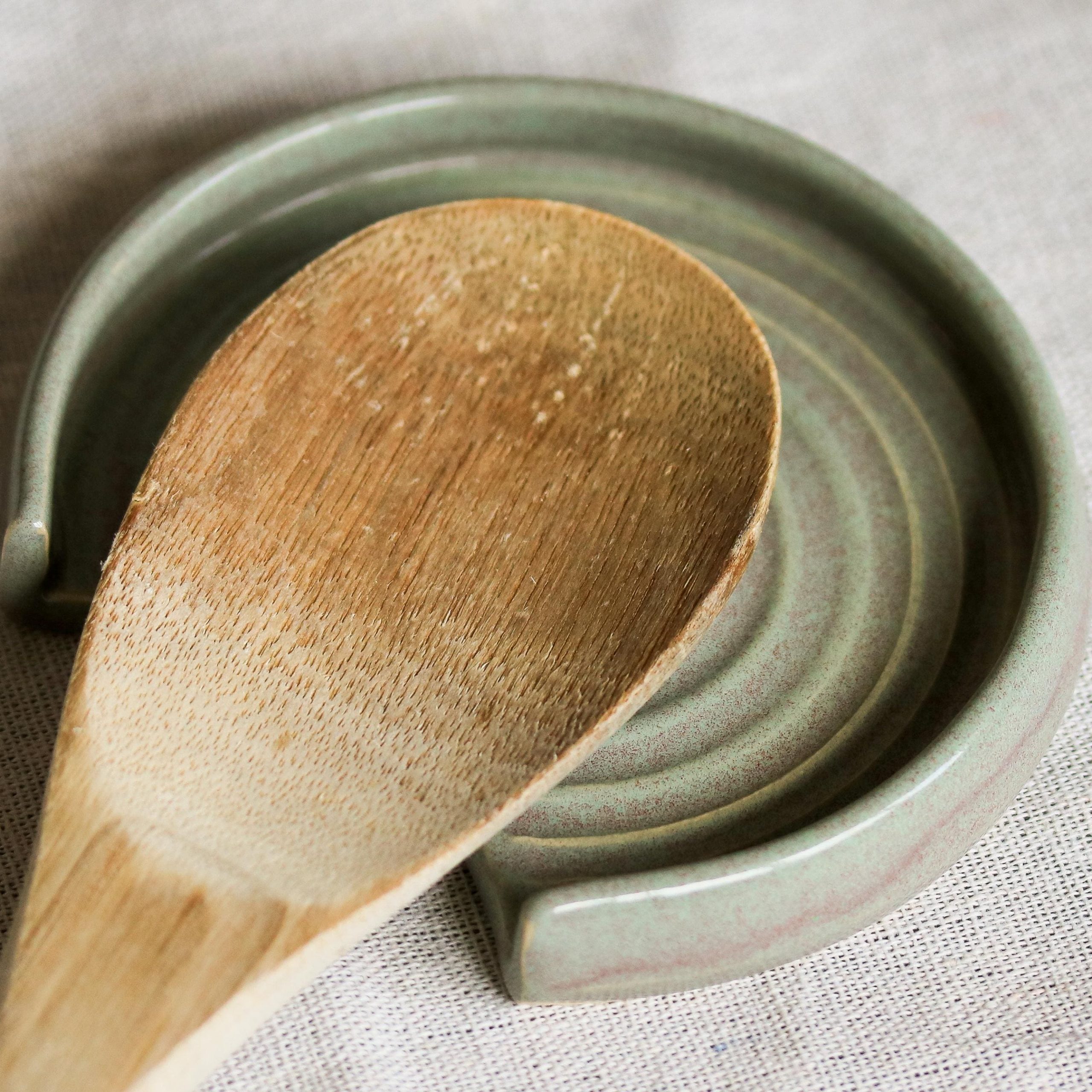 We hand throw on a wheel, then usually the next day the spoon rests are trimmed and left to dry thoroughly, after which they go through the first bisque firing. After this they are glazed by hand with a lovely Sage Green glaze and then fired again.