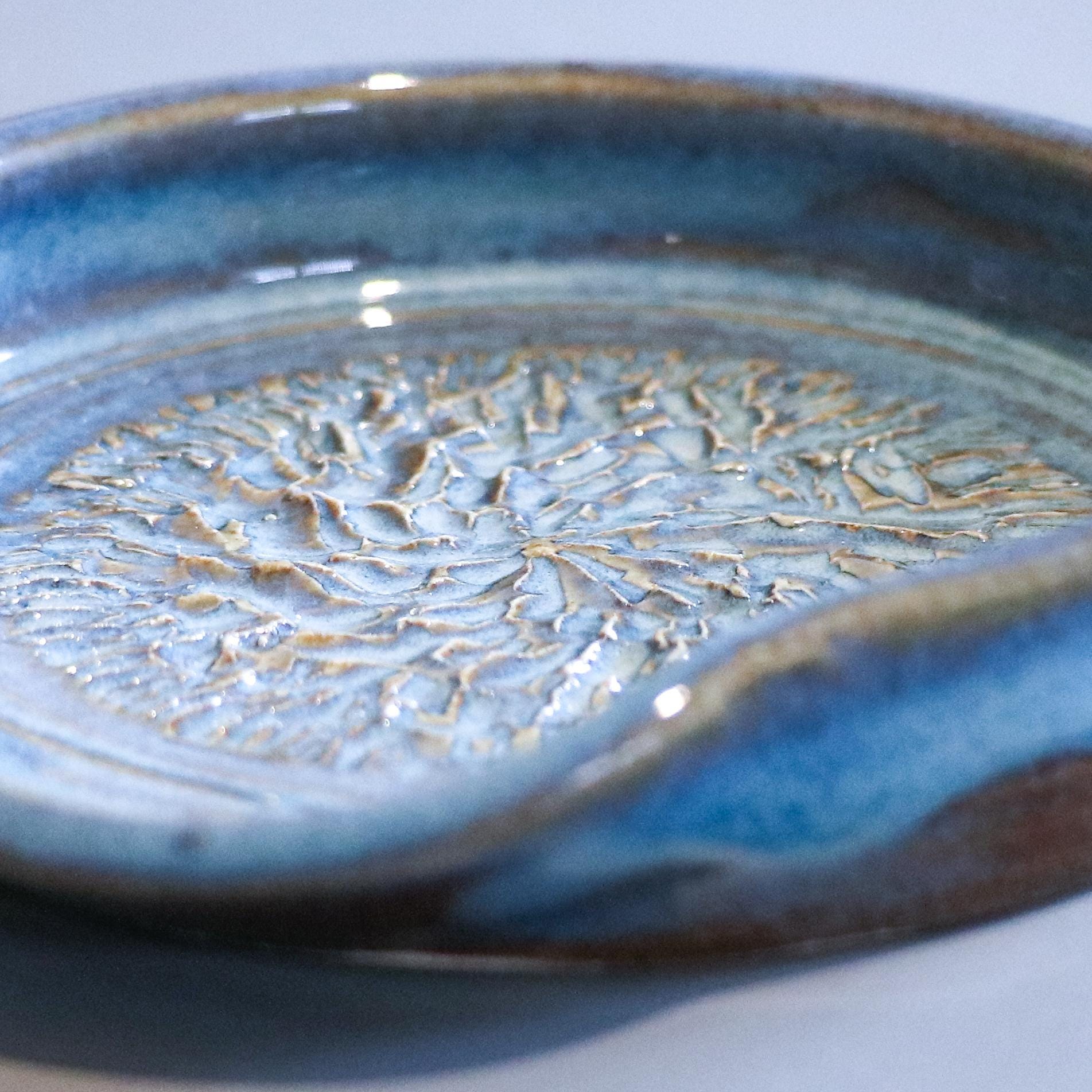 We hand throw on a wheel, then usually the next day the spoon rests are trimmed and left to dry thoroughly, after which they go through the first bisque firing. After this they are glazed by hand with a lovely blue Rutile glaze and then fired again, with the glaze breaking beautifully over the texture