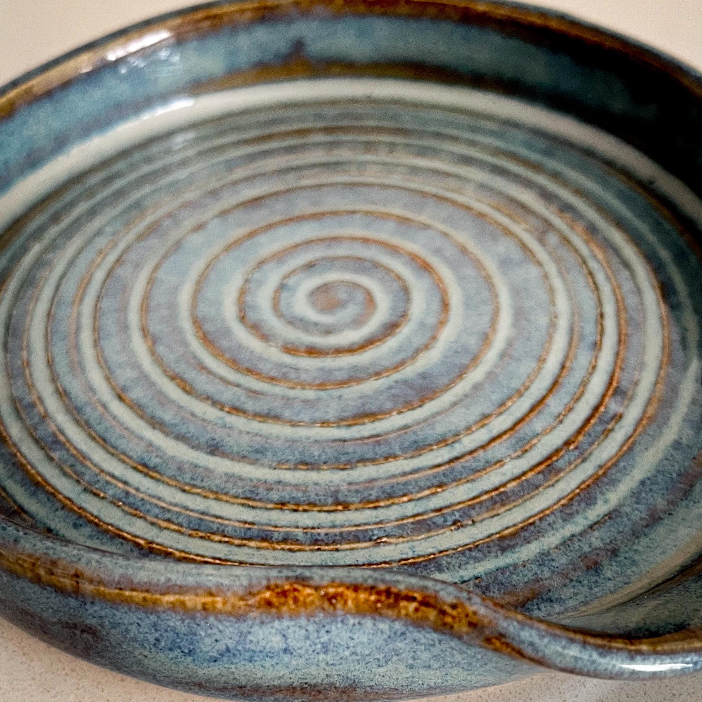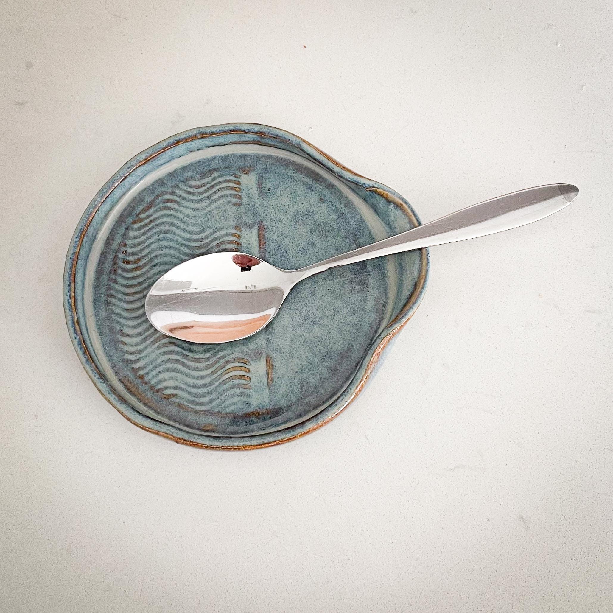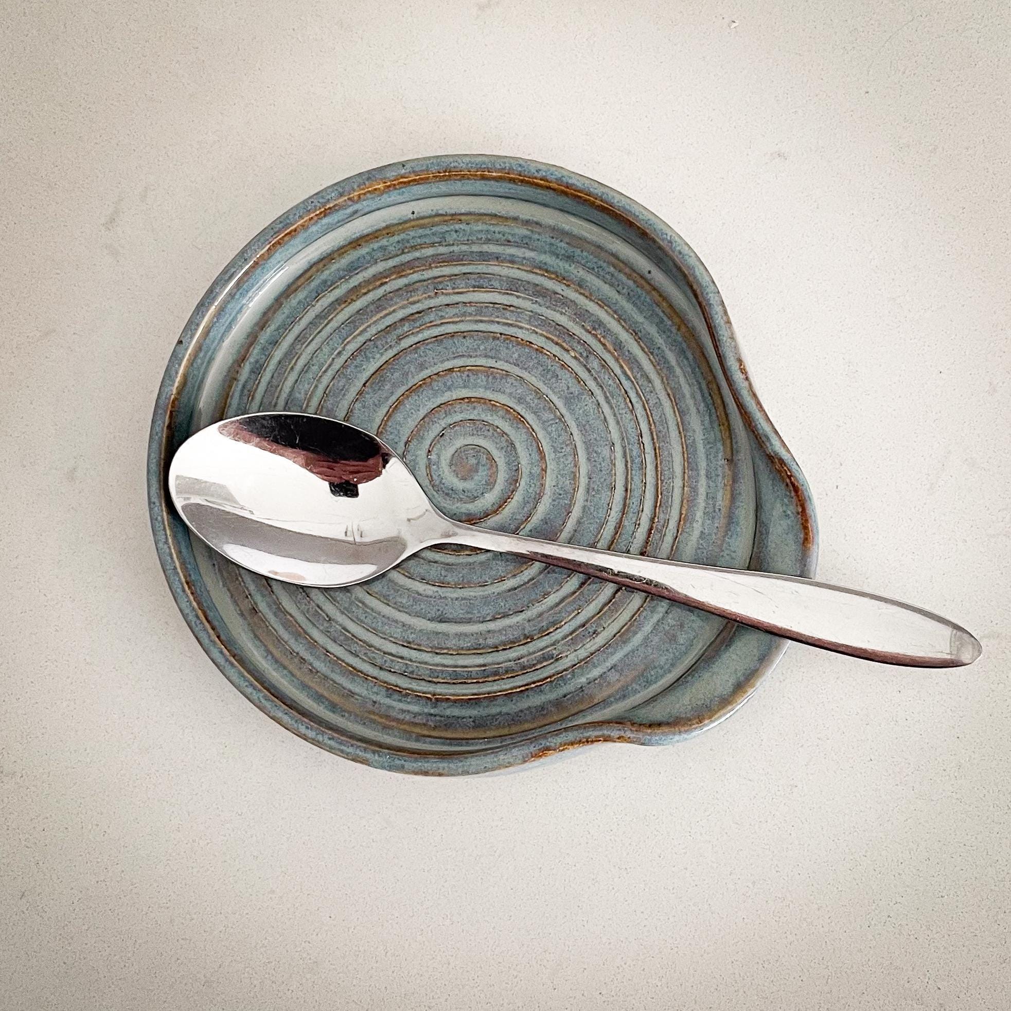 We hand throw on a wheel, then usually the next day the spoon rests are trimmed and left to dry thoroughly, after which they go through the first bisque firing. After this they are glazed by hand with a lovely blue rutile glaze and then fired again. Choose from a swirly lines pattern or circles Both look great with the glaze breaking beautifully over the texture