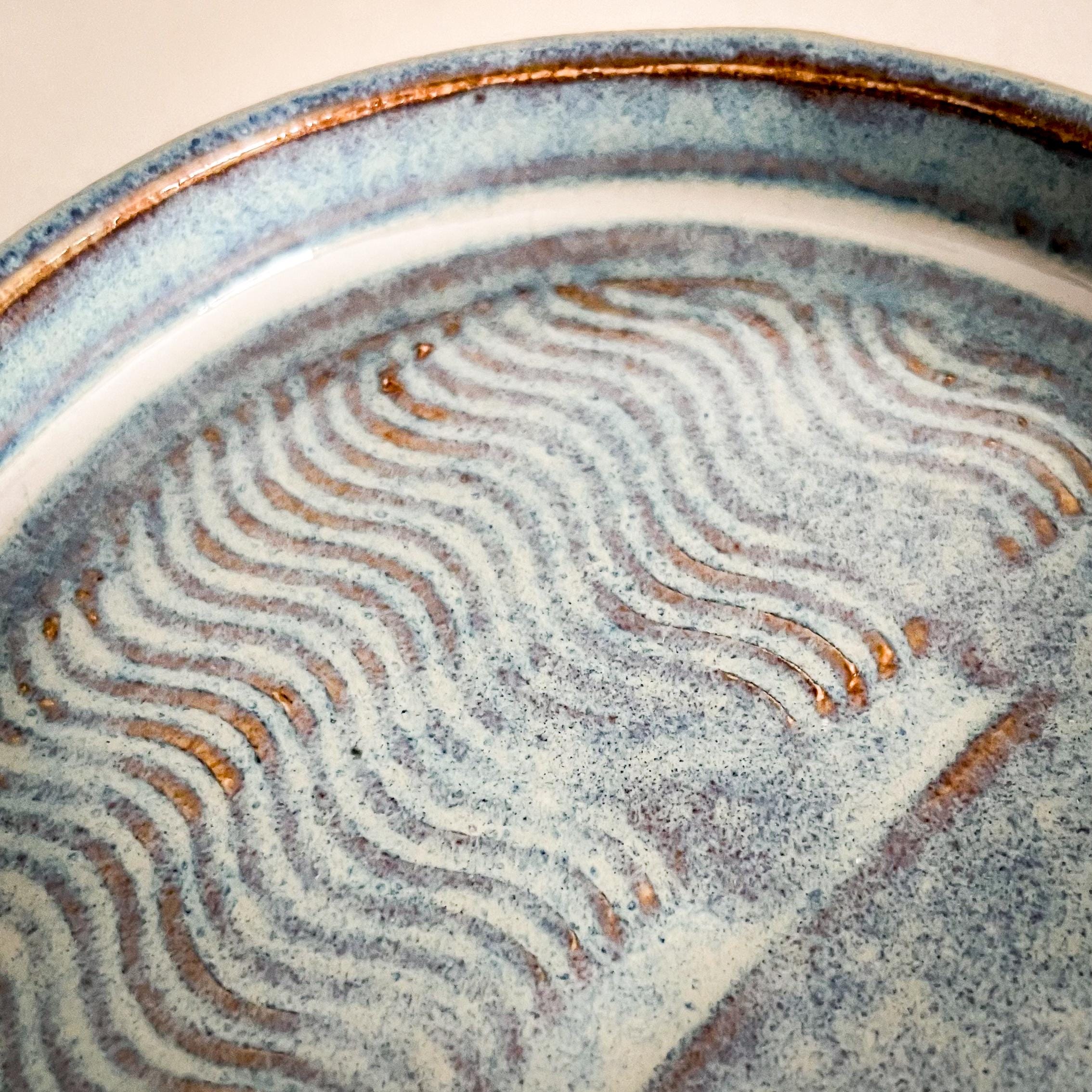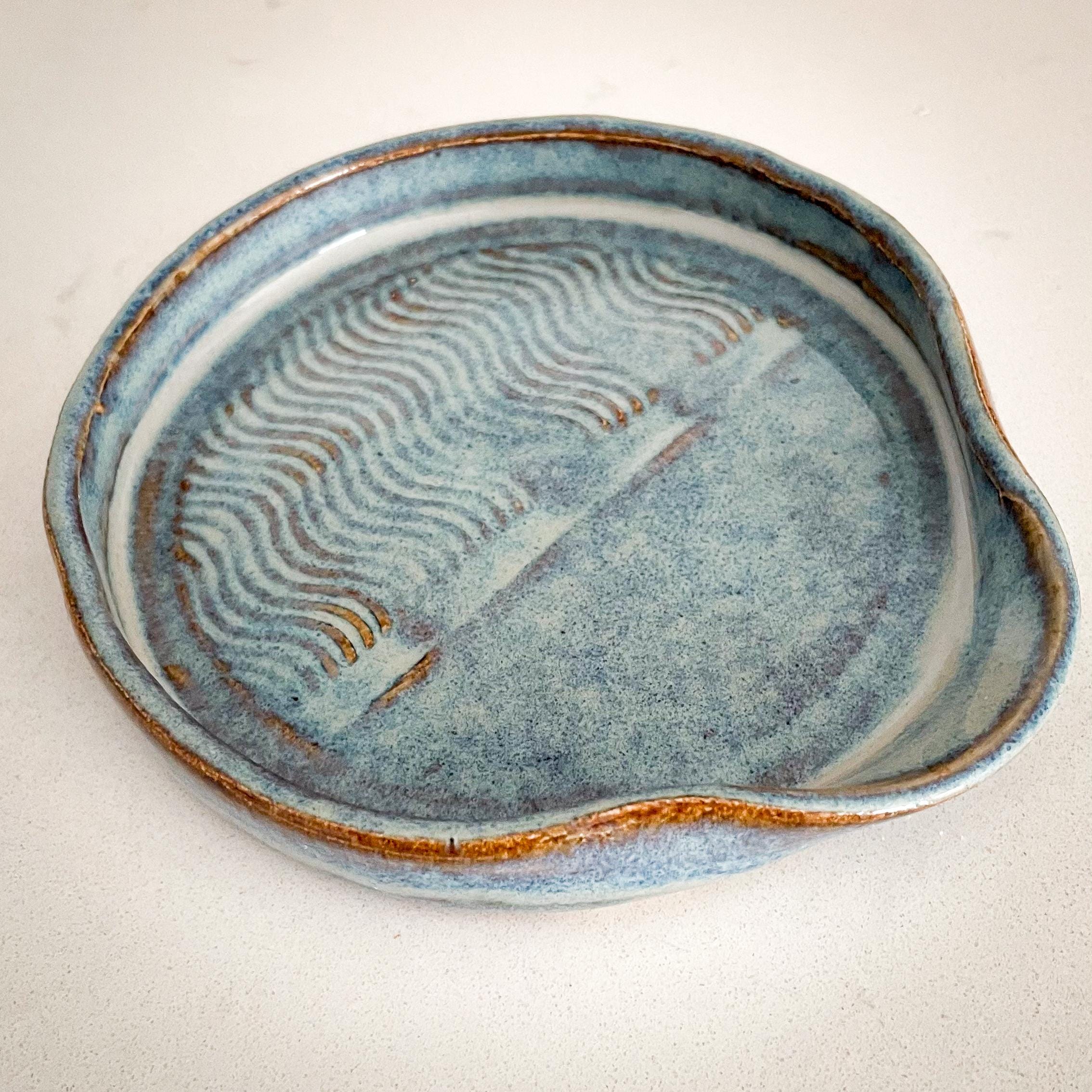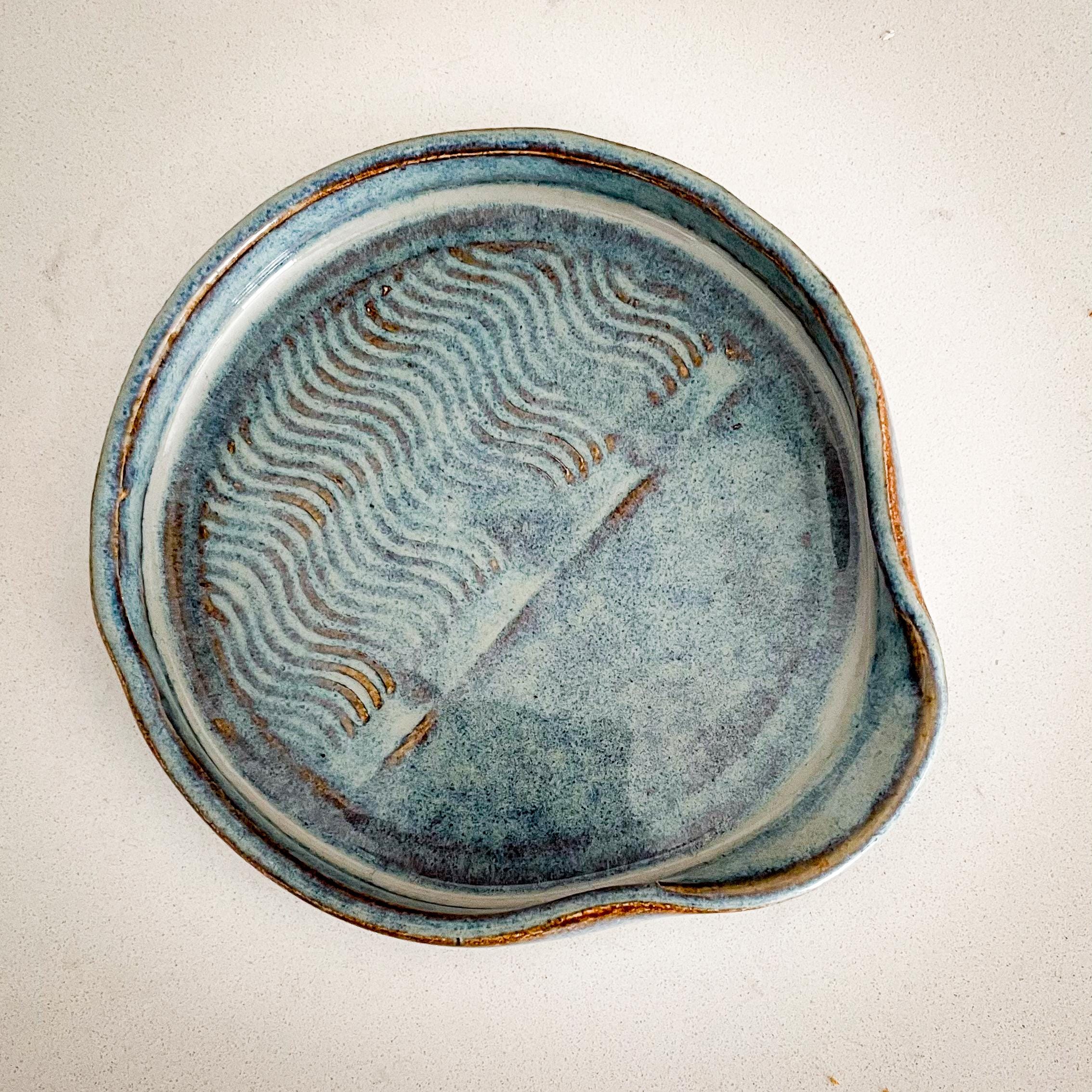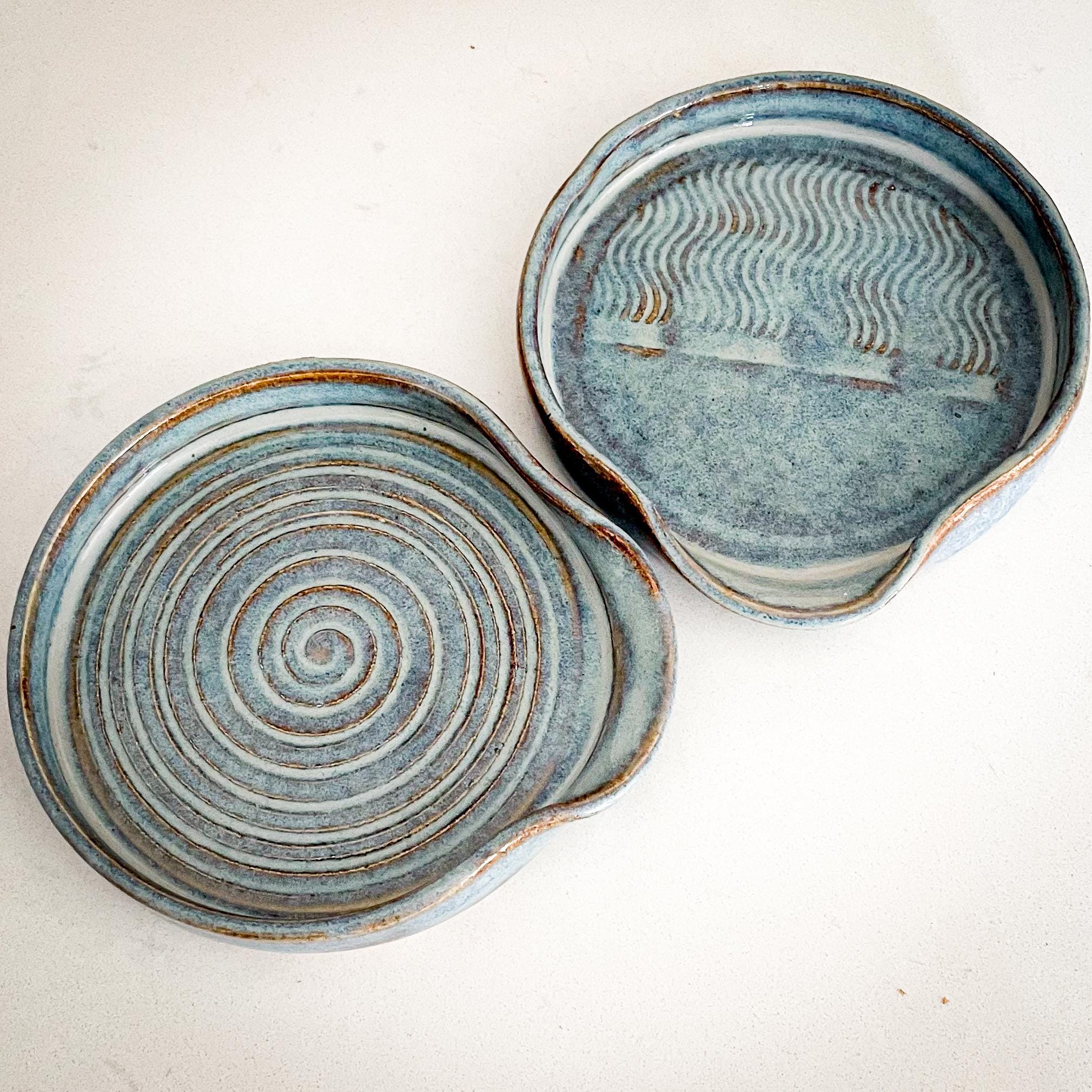We hand throw on a wheel, then usually the next day the spoon rests are trimmed and left to dry thoroughly, after which they go through the first bisque firing. After this they are glazed by hand with a lovely blue rutile glaze and then fired again. Choose from a swirly lines pattern or circles Both look great with the glaze breaking beautifully over the texture
