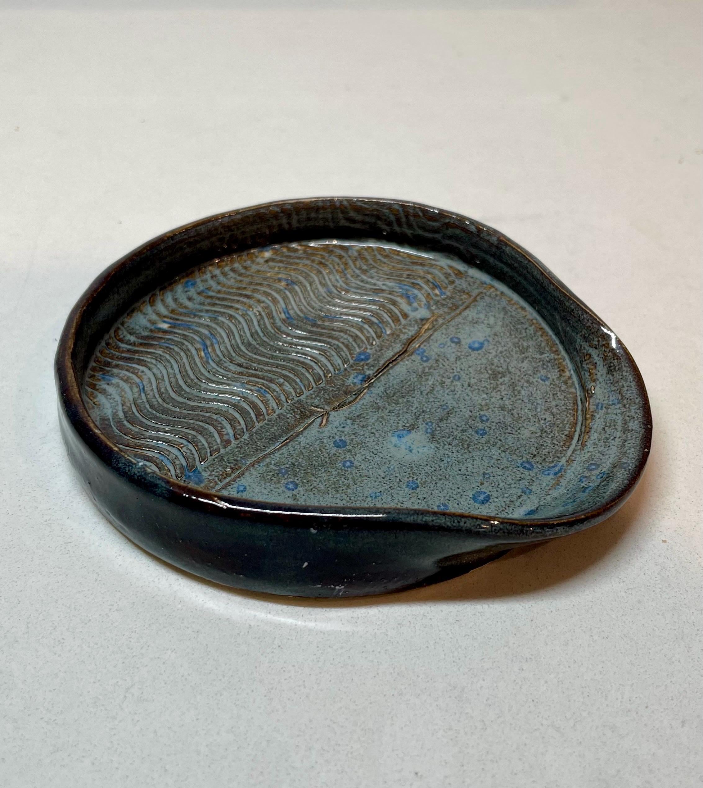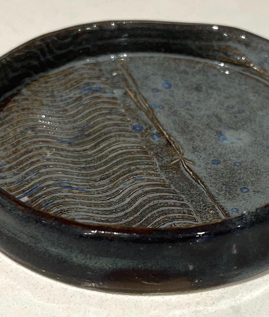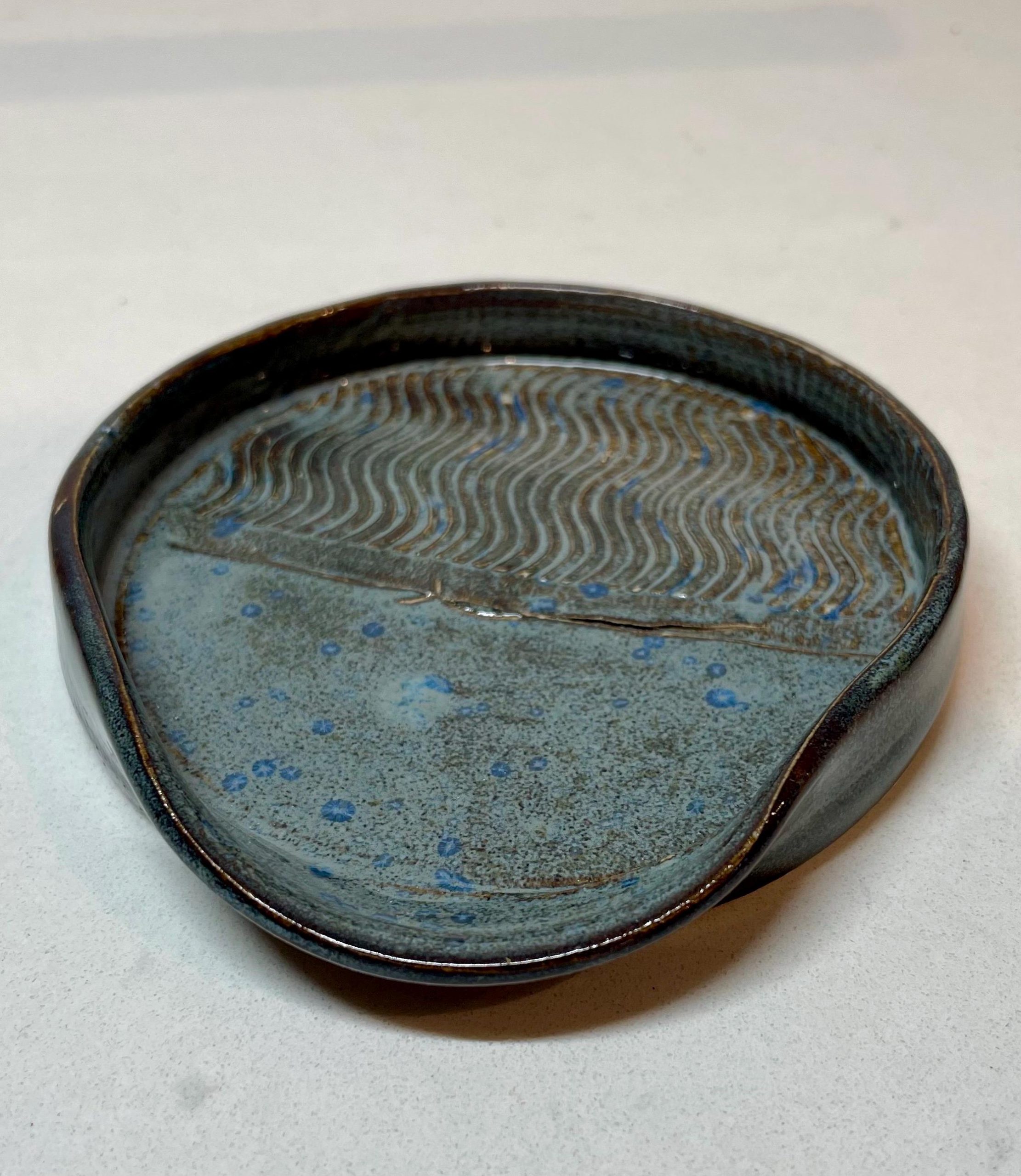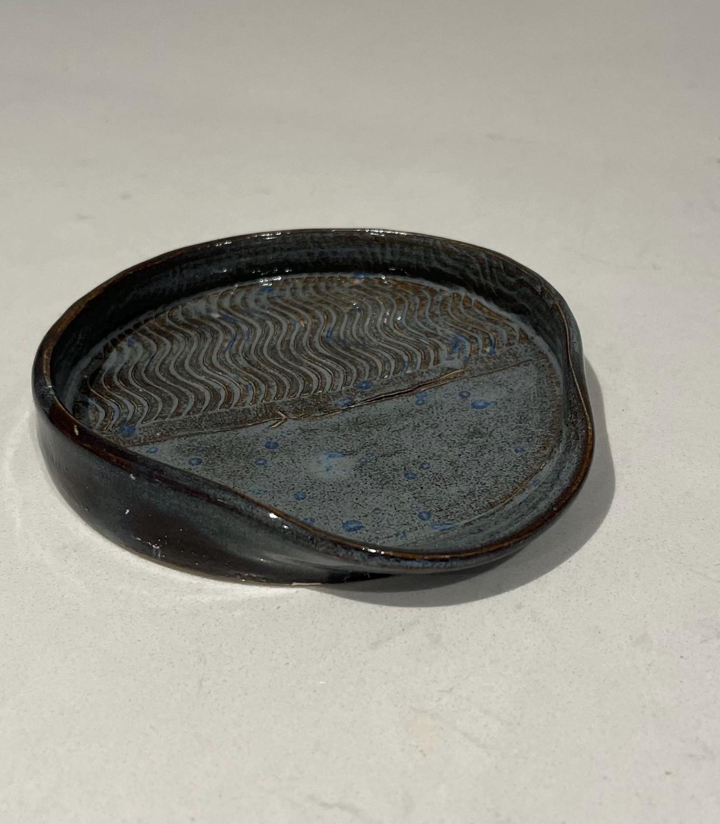We hand throw on a wheel, then usually the next day the spoon rests are trimmed and left to dry thoroughly, after which they go through the first bisque firing. After this they are glazed by hand with a lovely stonewashed denim glaze and then fired again. Choose from a swirly lines pattern or circles Both look great with the glaze breaking beautifully over the texture
