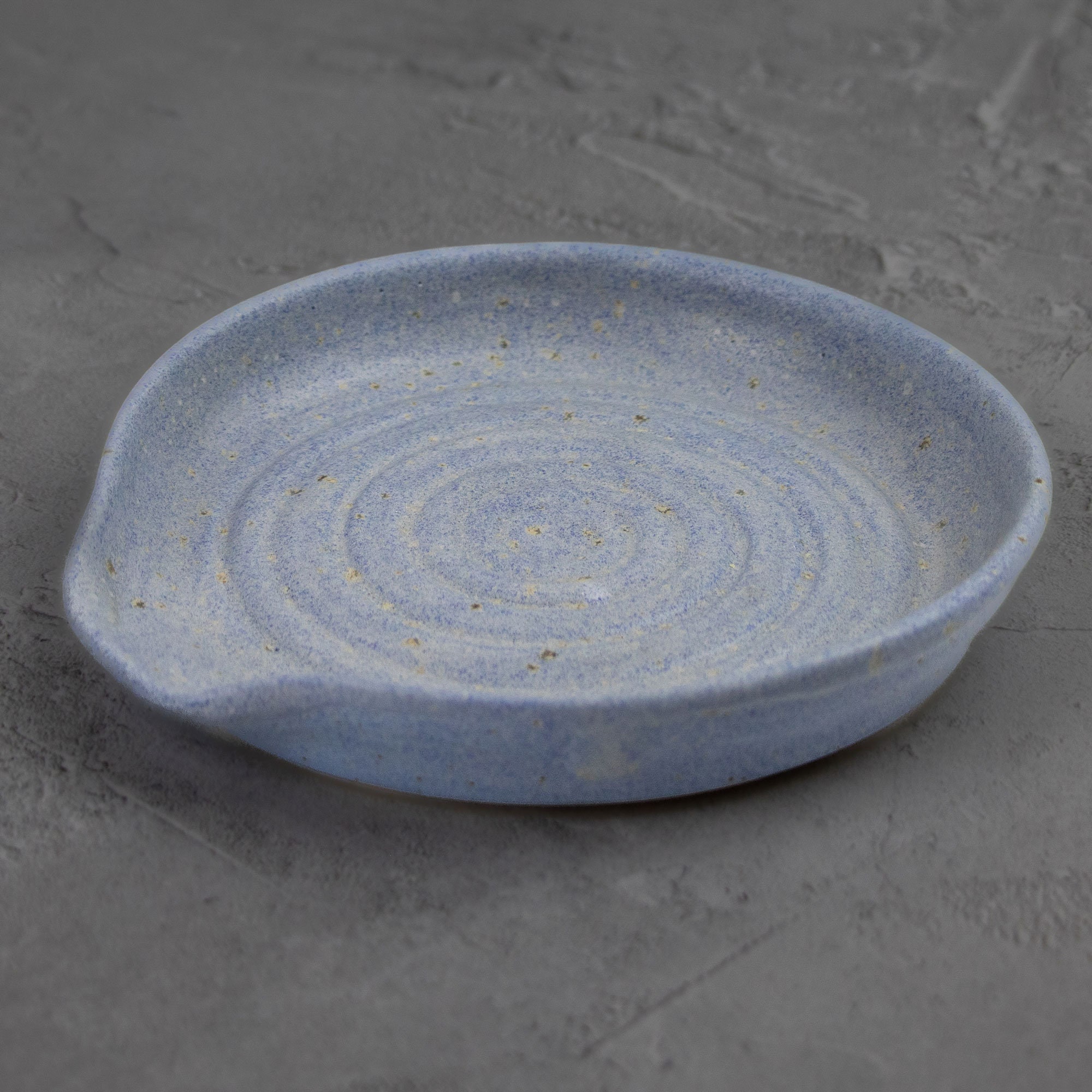 We hand throw on a wheel, then usually the next day the spoon rests are trimmed and left to dry thoroughly, after which they go through the first bisque firing. After this they are glazed by hand and then fired again These spoon rests are glazed in a Morning Rain speckled glaze.